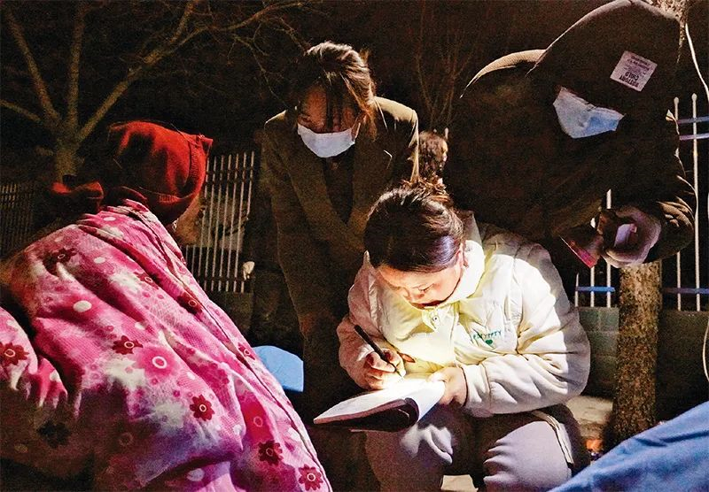 2023年12月19日,在甘肅省積石山縣中西醫(yī)結合醫(yī)院門口,當?shù)馗刹吭诘怯浭転娜罕娦畔ⅰ?8日23時59分,甘肅省臨夏回族自治州積石山保安族東鄉(xiāng)族撒拉族自治縣發(fā)生6.2級地震。(新華社記者?馬希平/攝)