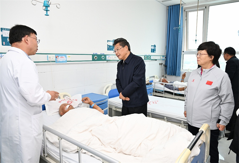 任振鶴還來(lái)到隴西縣第二人民醫(yī)院,看望這里收治的受傷群眾,了解救治情況。他強(qiáng)調(diào),要精心開(kāi)展后續(xù)治療工作,及時(shí)做好情緒疏導(dǎo)和心理?yè)嵛?,?zhēng)取讓傷員早日康復(fù)回家。