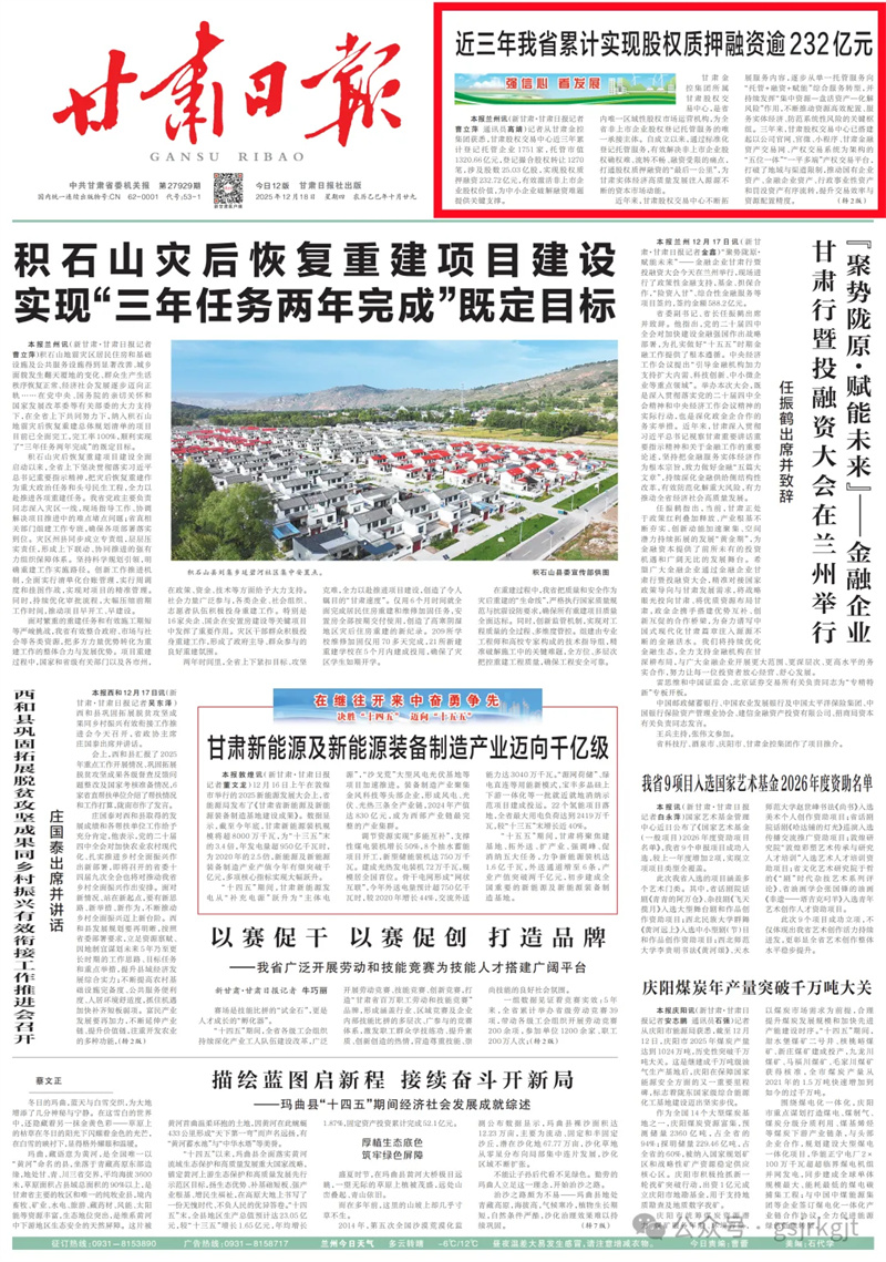 (新甘肅客戶端蘭州訊(新甘肅·甘肅日報記者曹立萍 通訊員高婧)記者從甘肅金控集團獲悉,甘肅股權(quán)交易中心近三年累計登記托管企業(yè)1751家,托管市值1320.66億元,登記撮合股權(quán)轉(zhuǎn)讓1270筆,涉及股數(shù)25.03億股,實現(xiàn)股權(quán)質(zhì)押融資232.72億元,有效激活非上市企業(yè)股權(quán)價值,為中小企業(yè)破解融資難題提供關(guān)鍵支撐。