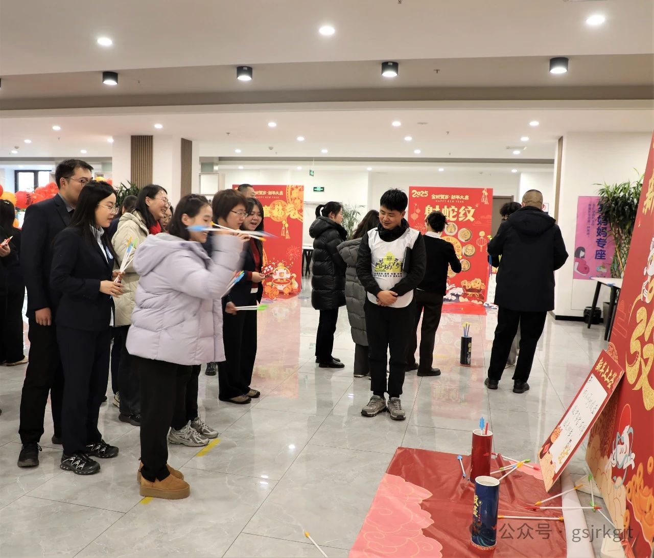 隨著鏗鏘有力的鑼鼓聲,兩只威武靈動(dòng)的“祥瑞金獅”躍入會(huì)場(chǎng),拉開(kāi)活動(dòng)序幕,在舞獅隊(duì)員輾轉(zhuǎn)騰挪間,集團(tuán)公司領(lǐng)導(dǎo)執(zhí)筆點(diǎn)睛,寓意新年開(kāi)新局。隨后開(kāi)展的“古韻新潮”游戲區(qū)人聲鼎沸,投壺游戲中的“上上簽”破空聲與歡呼聲此起彼伏,“射箭”靶場(chǎng)選手凝神靜氣“百步穿楊”,“釣魚(yú)”現(xiàn)場(chǎng)錦鱗翻飛笑鬧如潮,套圈環(huán)節(jié)精準(zhǔn)拋擲歡呼雀躍,冰壺賽道上更是上演“智謀對(duì)決”,團(tuán)隊(duì)協(xié)作的默契充分展現(xiàn)?,F(xiàn)場(chǎng)氣氛熱烈,歡笑與掌聲交織出歡樂(lè)的海洋。