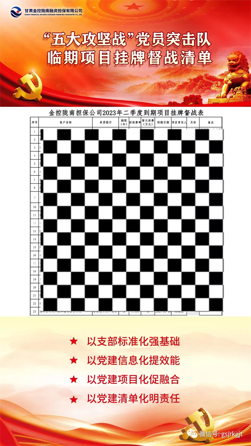 為扎實(shí)推進(jìn)“三抓三促”行動(dòng),全面落實(shí)集團(tuán)黨委黨建標(biāo)準(zhǔn)化、信息化、項(xiàng)目化、清單化建設(shè)要求,以高質(zhì)量黨建引領(lǐng)高質(zhì)量發(fā)展,金控隴南擔(dān)保創(chuàng)新“1+2+5”工作模式,全面打響黨建項(xiàng)目化攻堅(jiān)戰(zhàn)。